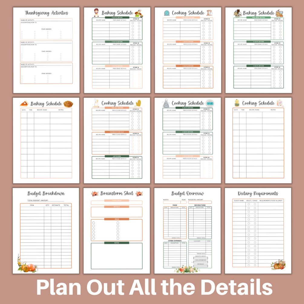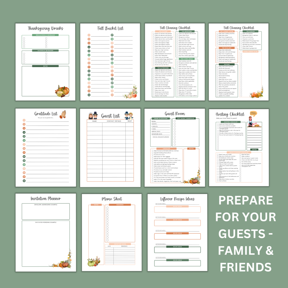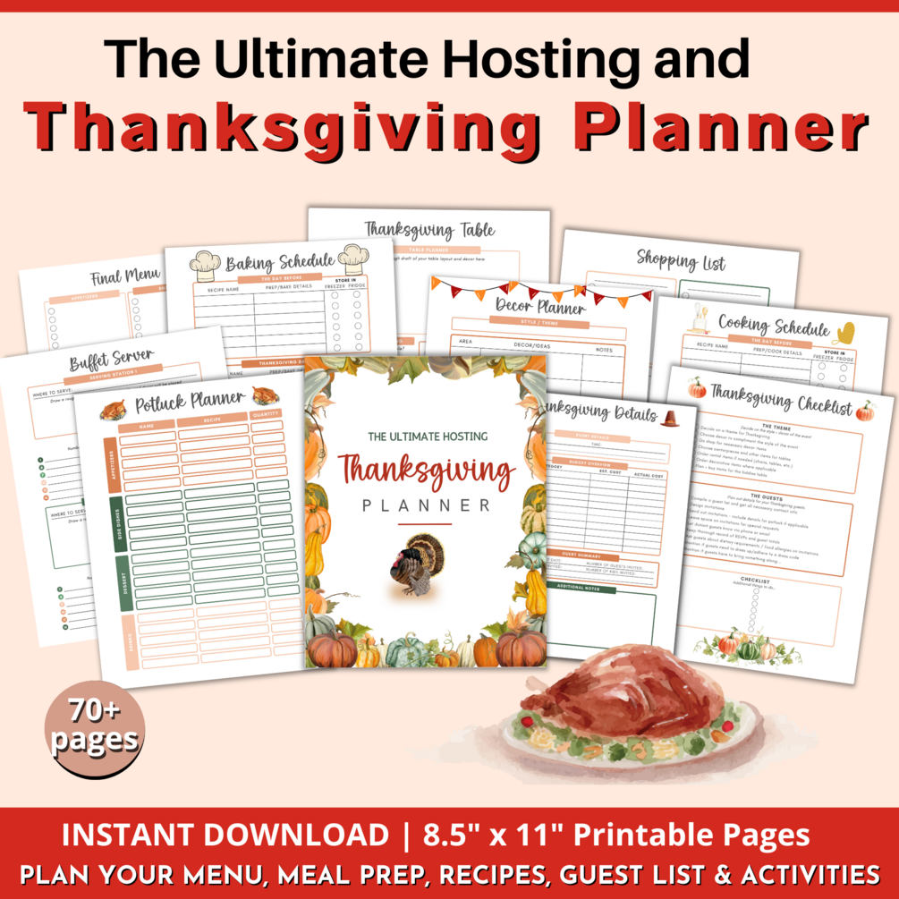 This beautiful Ultimate Hosting Thanksgiving Planner bundle will help you to plan all aspects of your Turkey Day get-together! The detailed pages have been created to help you plan out your entire menu, meal prep, cleaning schedule, guest room necessities, and recipes. Create your own holiday planner binder and get your house ready for guests and make all the necessary Thanksgiving preparations. We have thought of everything, so you just print out the worksheets and relax.