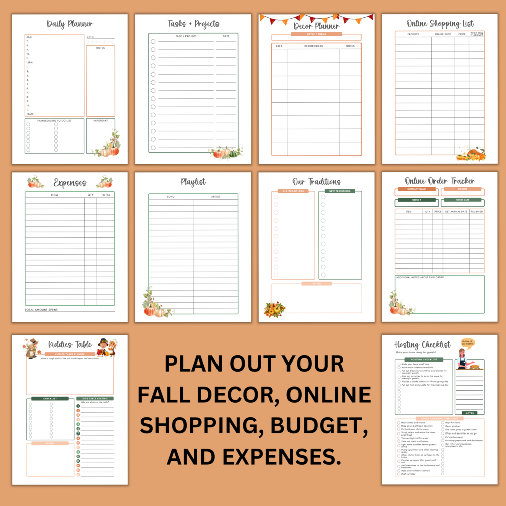 You'll get a digital file of 70 printable pages, letter size PDFs only. Instantly print out your Thanksgiving Planner and get your house Turkey Day ready for family, friends, neighbors, and guests.